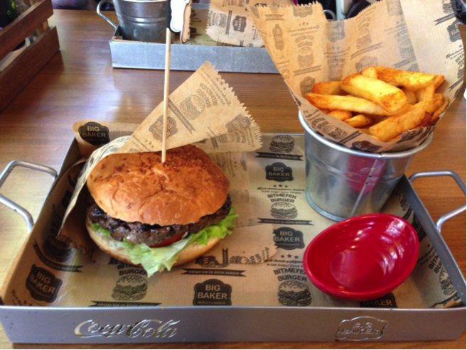Bahçelievler’e uğramışken farklı bir mekanda yemek yemek istiyorsanız ve kriterleriniz içinde kaliteli yemek, sıcak bir ortam ve iyi bir servis varsa size BigBaker’ı tanıtmama izin verin. Yeri dolayısıyla daha önce denk gelmediğimiz ama sosyal medya sayesinde öğrendiğimiz bir mekan oldu kendisi. Burger hastası iki arkadaş olarak hadi deneyelim, dedik ve ne yazık ki 2. Cadde’de bir nevi saklanmış bu mekanı bulmak için uzun süre yürüdük (Yazar notu: topukluyla yürümek mi? Yanlış seçim!). Mekanın kullandığınız kısmı kaldırıma konumlandırılmış durumda. Benim dikkatimi ilk çeken bu oldu, apartmanın içinde kalan kısım koca bir mutfak olmuş, üstelik açık, rahatça içerideki süreci takip edebiliyorsunuz. Mekanın ferah oluşu ve garsonlarının ilgisi de o gün için oldukça memnun ediciydi. Tek eksisi mekan dolu olmamasına rağmen siparişlerimizin biraz geç gelmesi oldu.