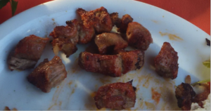 Kuzu şişleri de mideye indirdikten sonra günün finali olan kaburga şiş önümüze süzüldü. Tabii bu kadar harika bir yemeğin finaline kaburga şiş çok yakıştı. Zaten kaburgalar süzüldüğünde Sayısal Loto’da 6 tutturmuş kadar sevinçliydik. Kaburgaları anlatmaya yüreğimiz el vermiyor sizin sağlığınız için ama yine bir deneyelim. Kaburgalar da yine mükemmel bir kıvamda pişmişti tabii artık bu bizi hiç de şaşırtmıyordu. Etlerine çok dolgun olmasalar da baharatla yoğrulmuş bir lezzete sahiplerdi ve üzerlerindeki yağ oranı muhteşemdi. Zaten ne zaman geldi ne zaman yedik yine anlayamadık.